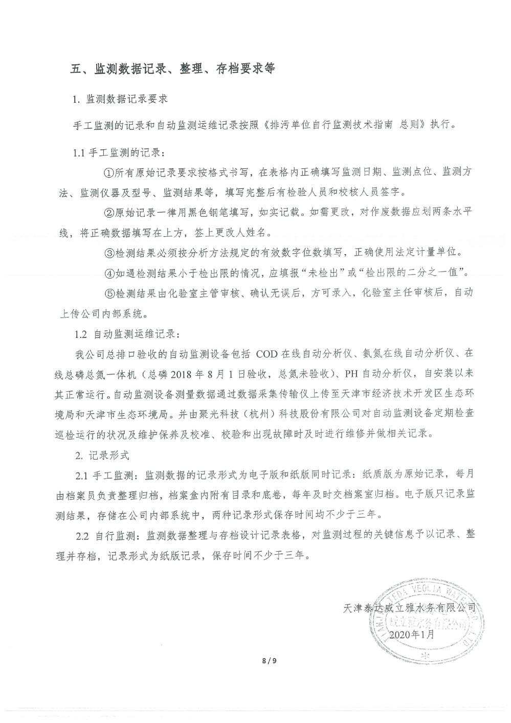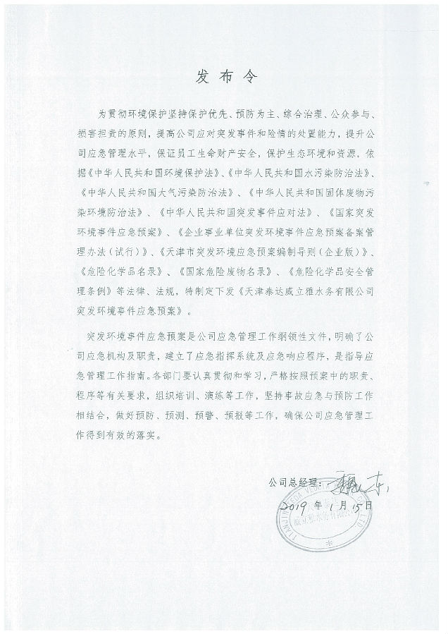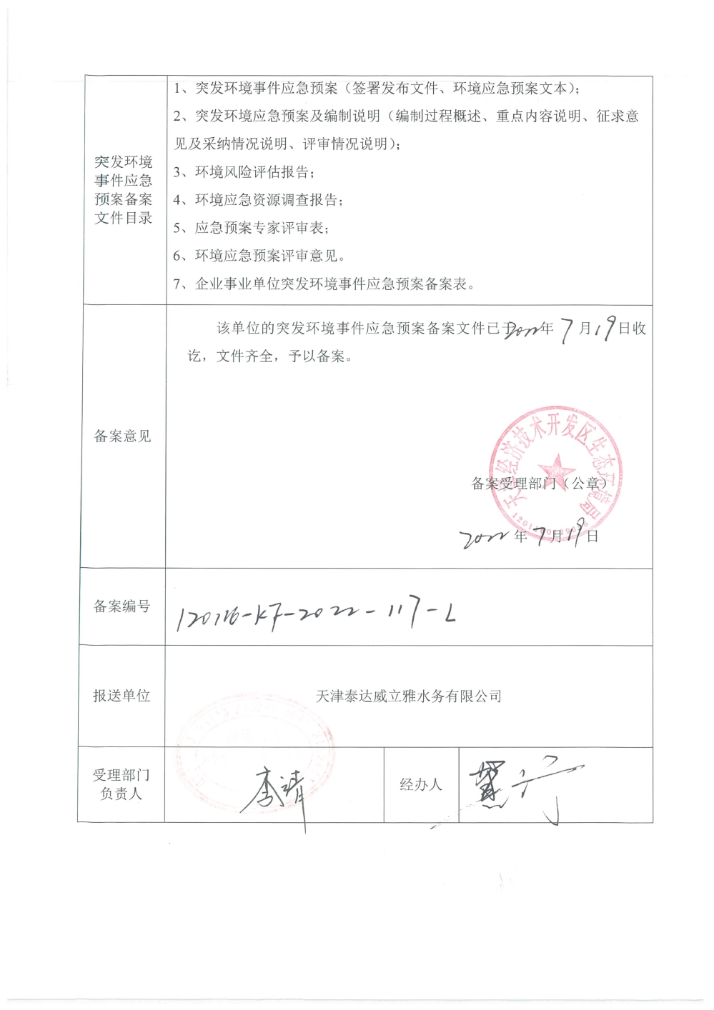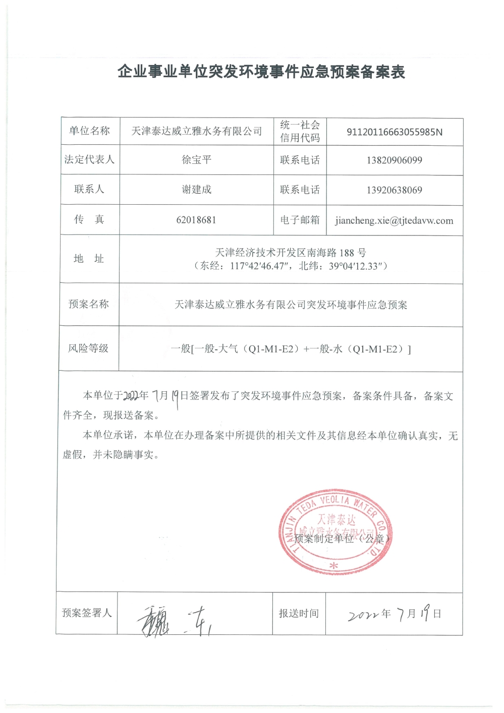 我公司根據《中華人民共和國環境保護法》以及《天津市突發事件總體應急預案》等相關文件要求,于2019年1月編制(修訂)完成了《天津泰達威立雅水務有限公司突發環境事件應急預案》, 2022年7月19日完成變更備案并發布(備案編號:120116-KF-2022-117-L)。